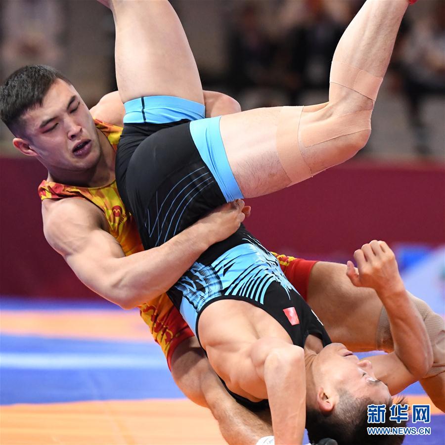 8月21日,中国选手张高泉(右)在比赛中与对手较量。 当日,在第18届亚运会摔跤男子古典式67公斤级铜牌争夺赛中,中国选手张高泉不敌吉尔吉斯斯坦选手伊斯梅洛夫,无缘奖牌。 新华社记者李贺摄