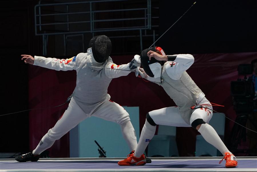 8月21日,中国选手黄梦恺(左)在比赛中。 当日,在亚运会击剑男子个人花剑决赛中,中国选手黄梦恺战胜中国香港选手崔浩然,获得冠军。 新华社记者王毓国摄