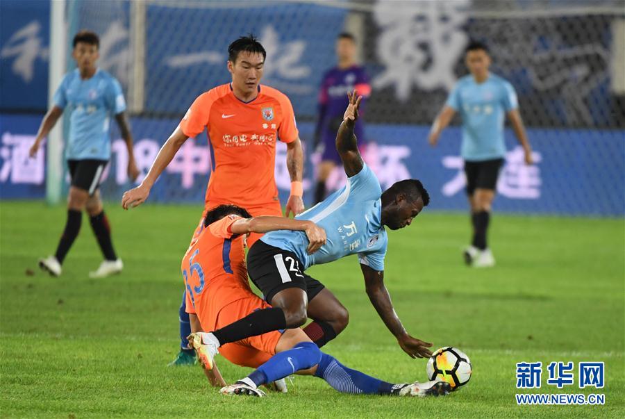 8月21日,大连一方队球员里亚斯科斯(右下)和山东鲁能泰山队球员戴琳(左下)在比赛中拼抢。 当日,在2018年中国足协杯半决赛首回合比赛中,山东鲁能泰山队客场以1比0战胜大连一方队。 新华社记者杨青摄