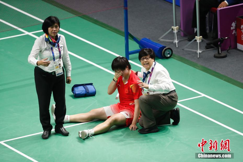 羽毛球女团决赛第二单打何冰娇比赛中肩部意外受伤