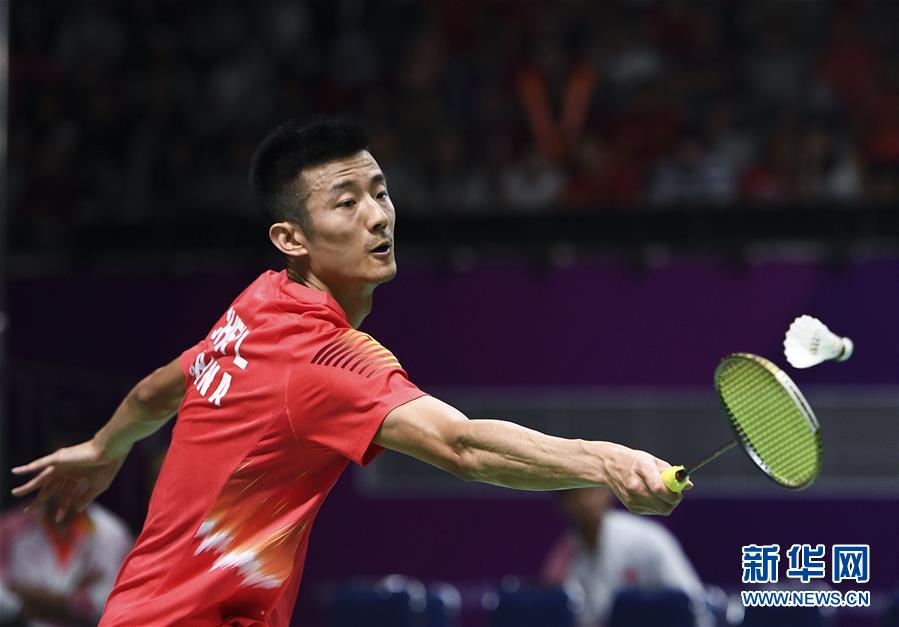 8月22日,中国队球员谌龙在比赛中。 当日,在第18届亚运会羽毛球男子团体决赛中,中国队迎战印度尼西亚队。 新华社记者李响摄