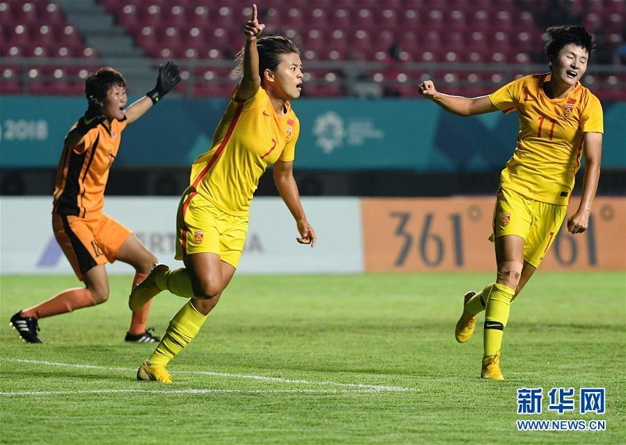 8月22日,中国队球员王霜(中)庆祝进球。 当日,在第18届亚运会女足小组赛中,中国队2比0战胜朝鲜队。 新华社发(王申摄)