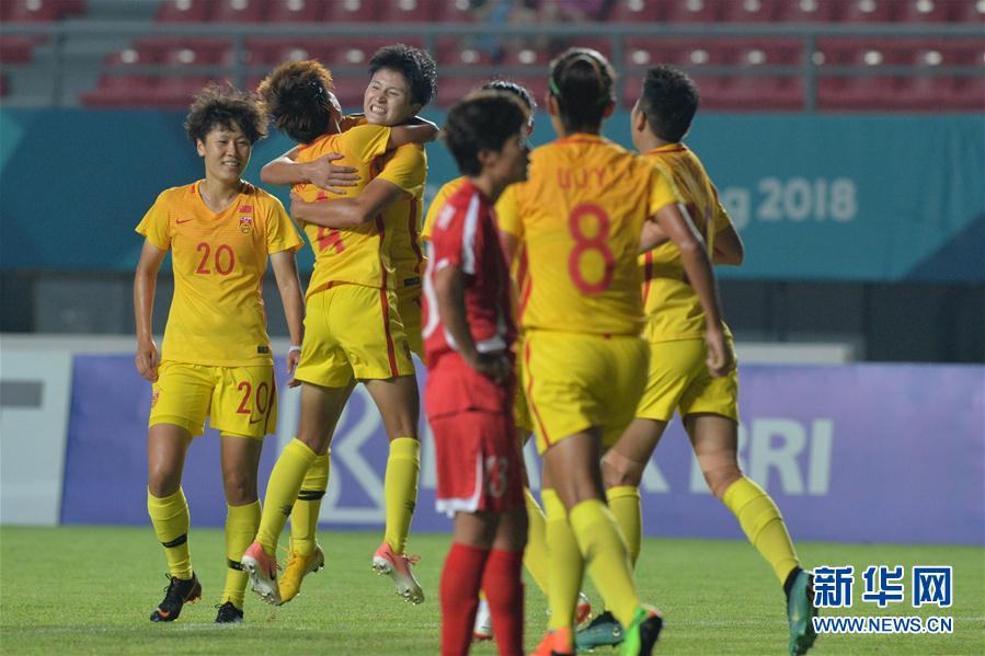 8月22日,中国队球员娄佳惠(左二)和队友拥抱庆祝进球。 当日,在第18届亚运会女足小组赛中,中国队2比0战胜朝鲜队。 新华社发(维里·萨诺弗里摄)