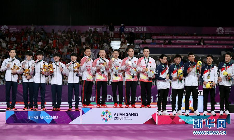 8月22日,中国队(中)、日本队(左)与韩国队在领奖台上。 当日,在第18届亚运会体操男子团体决赛中,中国队以260.950分的总成绩获得冠军,日本队获得亚军,韩国队获得季军。 新华社记者朱炜摄