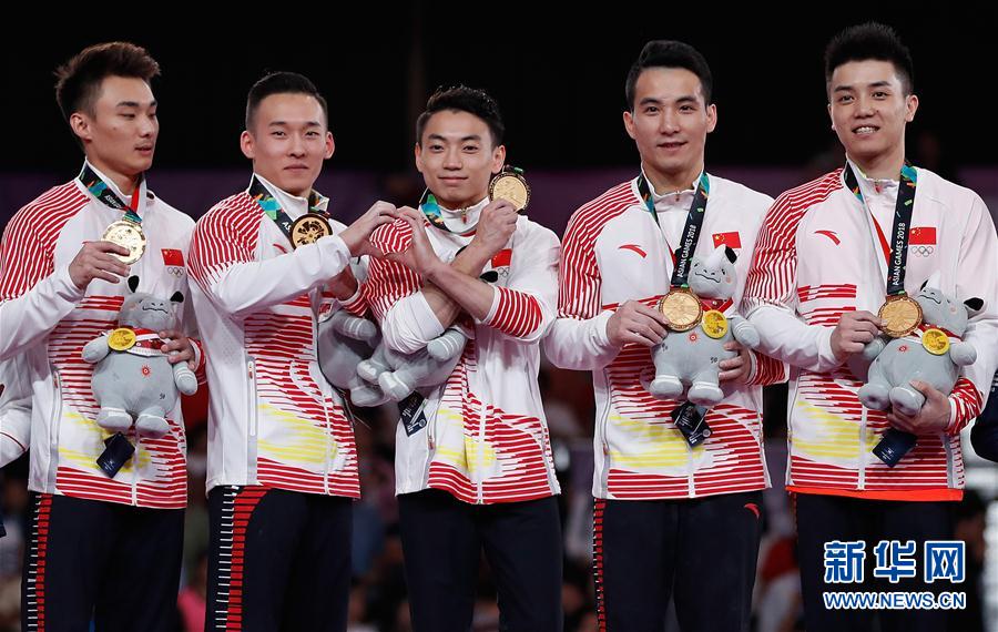 8月22日,中国队选手(从左至右)孙炜、肖若腾、邹敬园、邓书弟与林超攀在颁奖仪式上合影。肖若腾(左二)与邹敬园(中)摆出比心手势。 当日,在第18届亚运会体操男子团体决赛中,中国队以260.950分的总成绩获得冠军。 新华社记者王丽莉摄