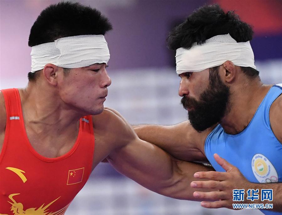 8月22日,中国选手杨斌(左)与印度选手辛格同时头裹纱布比赛。 当日,第18届亚运会摔跤男子古典式77公斤级比赛在雅加达进行。 新华社记者李贺摄