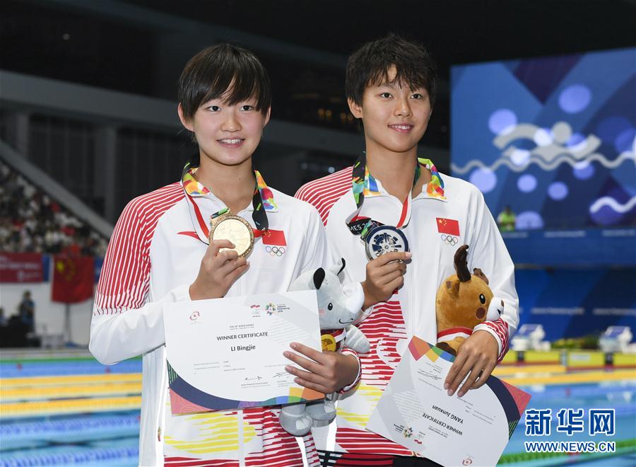 8月22日,中国选手李冰洁(左)和杨浚瑄在颁奖仪式上。 当日,在第18届亚运会女子200米自由泳决赛中,中国选手李冰洁以1分56秒74的成绩夺冠,中国选手杨浚瑄以1分57秒48的成绩获得亚军。 新华社记者岳月伟摄
