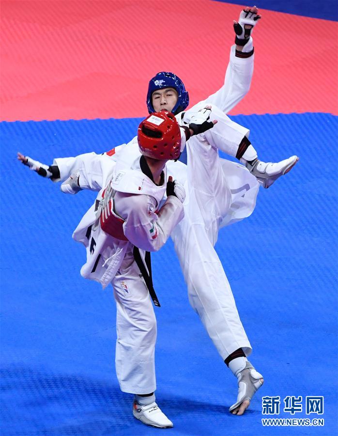 8月22日,中国选手赵帅(右)在比赛中。 当日,在第18届亚运会跆拳道男子63公斤以下级决赛中,中国选手赵帅以11比17不敌伊朗选手侯赛尼,获得银牌。 新华社记者黄宗治摄