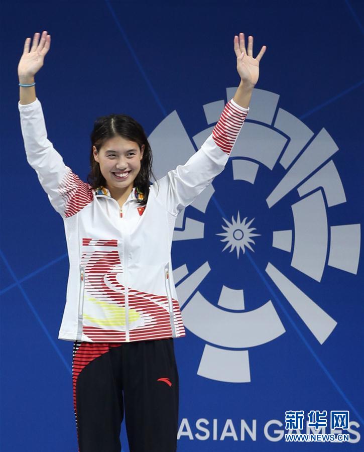 8月22日,中国选手张雨霏在颁奖仪式上。 当日,在第18届亚运会女子200米蝶泳决赛中,中国选手张雨霏以2分06秒61的成绩夺冠。 新华社记者费茂华摄