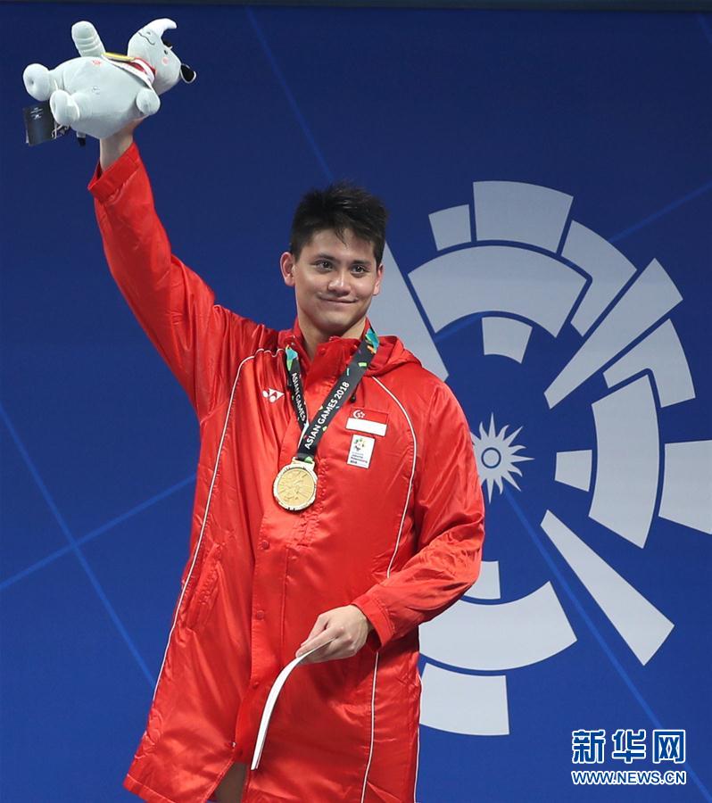 8月22日,新加坡选手斯库林在颁奖仪式上。 当日,在第18届亚运会男子100米蝶泳决赛中,新加坡选手斯库林以51秒04的成绩夺冠。 新华社记者费茂华摄