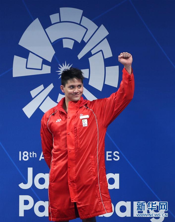 8月22日,新加坡选手斯库林在颁奖仪式上。 当日,在第18届亚运会男子100米蝶泳决赛中,新加坡选手斯库林以51秒04的成绩夺冠。 新华社记者费茂华摄