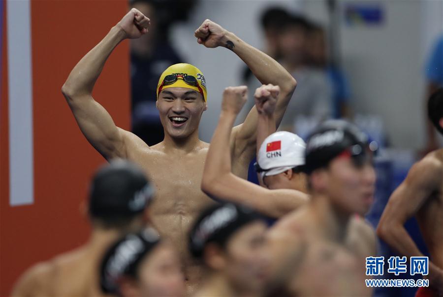 8月22日,中国选手徐嘉余庆祝。 当日,在第18届亚运会男女4X100米混合泳接力决赛中,中国队以3分40秒45的成绩夺冠。 新华社记者费茂华摄