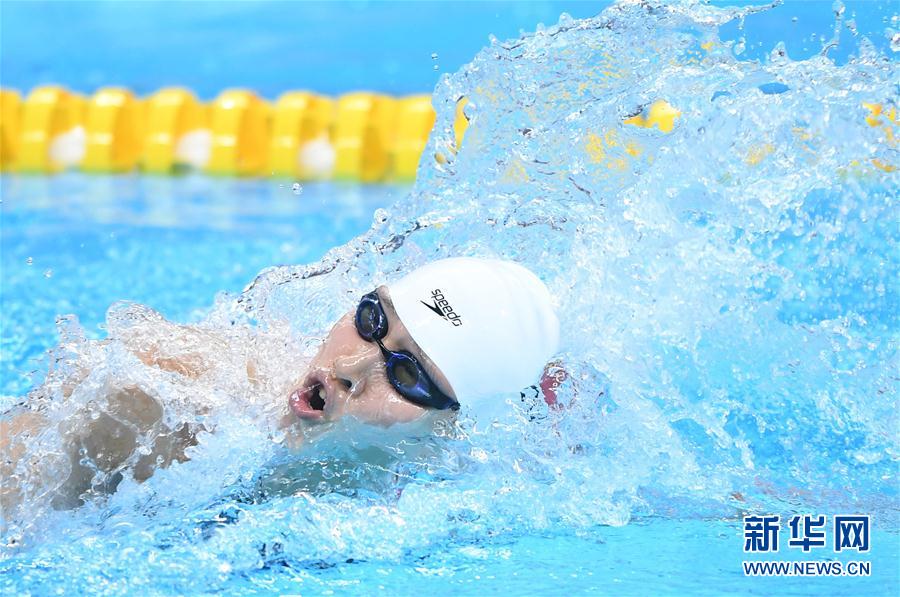 8月22日,中国选手朱梦惠在比赛中。 当日,在第18届亚运会男女4X100米混合泳接力决赛中,中国队以3分40秒45的成绩夺冠。 新华社记者潘昱龙摄