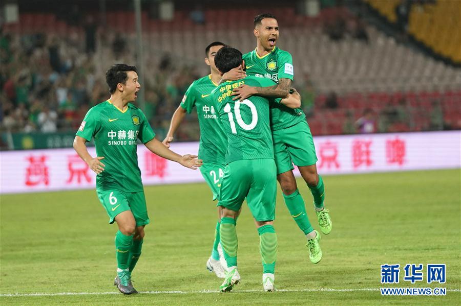 8月22日,北京中赫国安队球员比埃拉(右一)进球后与队友庆祝。 当日,在2018年中国足协杯半决赛首回合比赛中,北京中赫国安队主场以5比1战胜广州富力队。 新华社记者鞠焕宗摄