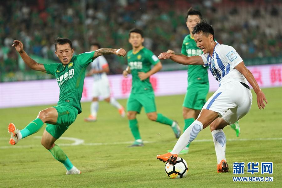 8月22日,北京中赫国安队球员金泰延(左一)在比赛中防守广州富力队球员常飞亚(右一)。 当日,在2018年中国足协杯半决赛首回合比赛中,北京中赫国安队主场以5比1战胜广州富力队。 新华社记者鞠焕宗摄