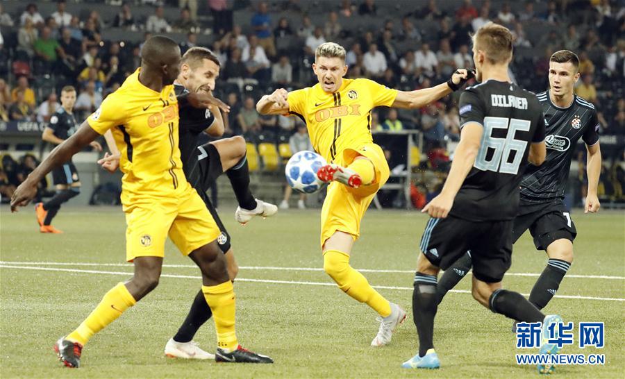 ↑8月22日,伯尔尼年轻人队球员法斯纳赫特(中)在比赛中争抢。 当日,在2018-2019赛季欧洲足球冠军联赛资格赛附加赛中,瑞士伯尔尼年轻人队主场以1比1战平克罗地亚萨格勒布迪纳摩队。 新华社发(鲁本·斯布里奇摄)