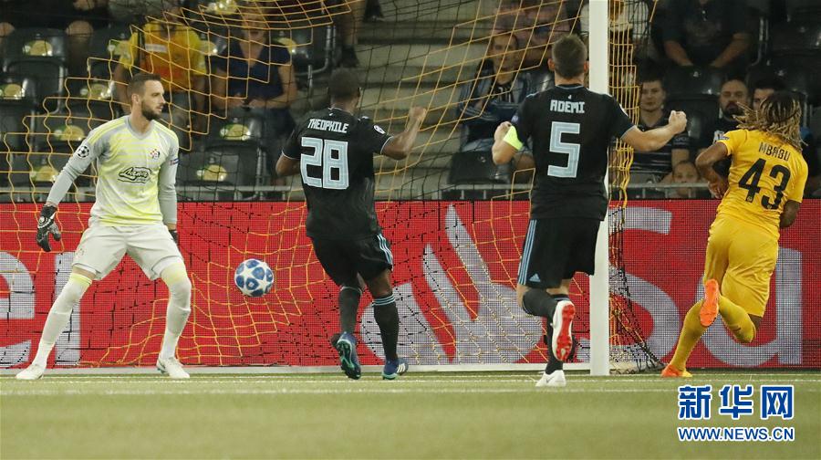 ↑8月22日,伯尔尼年轻人队球员姆巴布(右一)在比赛中射门得分。 新华社发(鲁本·斯布里奇摄)