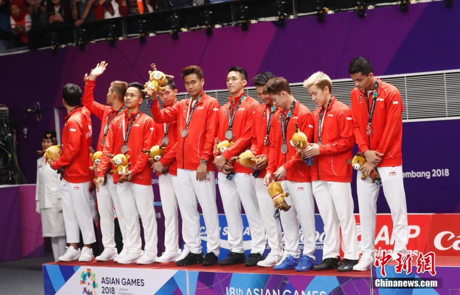 8月22日晚,雅加达亚运会羽毛球男团决赛中,中国羽毛球队经历将近五小时的鏖战,最终3:1力克东道主印尼夺冠。担任第一单打的石宇奇为国羽先拔头筹,印尼第一双打组合吉迪恩/苏卡穆约战胜李俊慧/刘雨辰扳平比分,但随后谌龙、刘成/张楠均战胜对手,为国羽锁定金牌,而担任第三单打的林丹并未出场。图为颁奖仪式。中新社记者 杜洋 摄