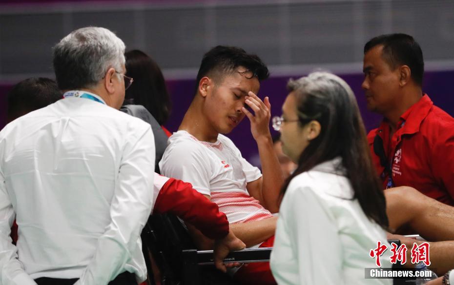 8月22日晚,雅加达亚运会羽毛球男团决赛中,中国羽毛球队经历将近五小时的鏖战,最终3:1力克东道主印尼夺冠。担任第一单打的石宇奇为国羽先拔头筹,印尼第一双打组合吉迪恩/苏卡穆约战胜李俊慧/刘雨辰扳平比分,但随后谌龙、刘成/张楠均战胜对手,为国羽锁定金牌,而担任第三单打的林丹并未出场。图为与石宇奇对阵的印尼选手金亭因伤退赛。中新社记者 杜洋 摄