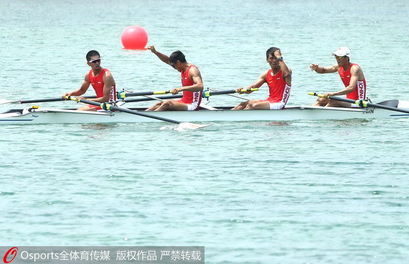 人民网北京8月23日电(李乃妍 实习生陈呈)北京时间今日,雅加达亚运会赛艇男子轻量级四人单桨无舵手中,中国队夺魁摘金。(Osports全体育传媒专供人民体育 版权作品 严禁转载)