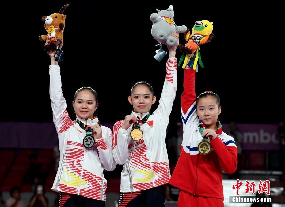 8月23日晚间,雅加达亚运会体操女子高低杠决赛,中国选手刘婷婷以14.600分夺得冠军,另一位中国选手罗欢以14.225分获得亚军,朝鲜选手获得第三名。图为刘婷婷(中)、罗欢(左)和朝鲜选手在颁奖仪式上合影。中新社记者 侯宇 摄