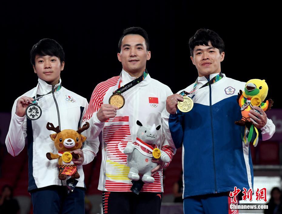 8月23日晚间,雅加达亚运会体操男子吊环决赛,中国选手邓书弟14.750分获得冠军,日本选手野野村笙吾和中国台北选手陈智郁分获二、三名。图为吊环冠军中国选手邓书弟(中)、亚军日本选手野野村笙吾(左)和季军中国台北选手陈智郁在颁奖仪式上合影。中新社记者 侯宇 摄
