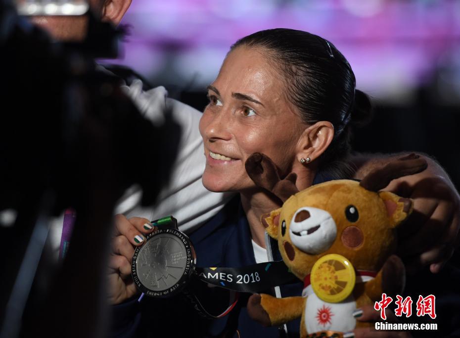 8月23日,雅加达亚运会体操女子跳马决赛,乌兹别克斯坦选手奥克萨娜·丘索维金娜以14.287分获得一枚银牌。现年43岁的丘索维金娜此前为了给患白血病的儿子筹款治病,曾代表不同国家多次参加体操世锦赛和奥运会,如今儿子已经康复,“体操妈妈”再次代表乌兹别克斯坦参加雅加达亚运会,继续其体操梦想。图为丘索维金娜赛后展示自己的银牌。中新社记者 侯宇 摄