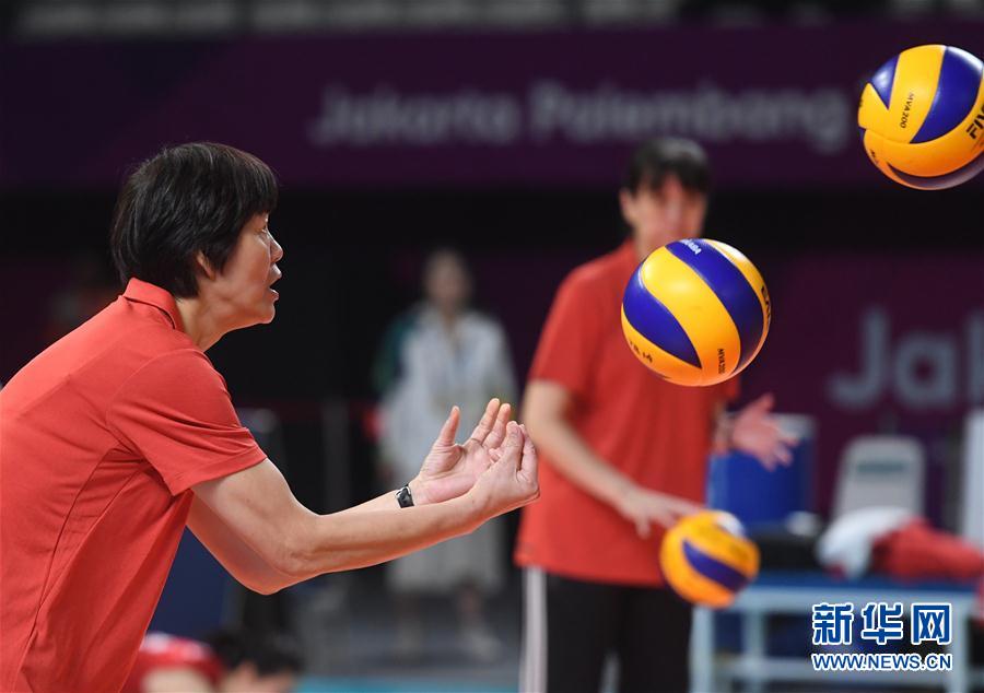 8月23日,中国队主教练郎平在比赛前。当日,在第18届亚运会女子排球B组小组赛中,中国队3-0战胜韩国队。新华社记者杜宇摄