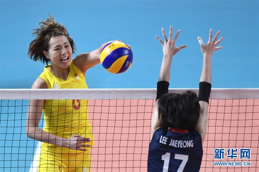 8月23日,中国队球员曾春蕾(左)在比赛中进攻。 当日,在第18届亚运会女子排球B组小组赛中,中国队3-0战胜韩国队。 新华社记者黄宗治摄