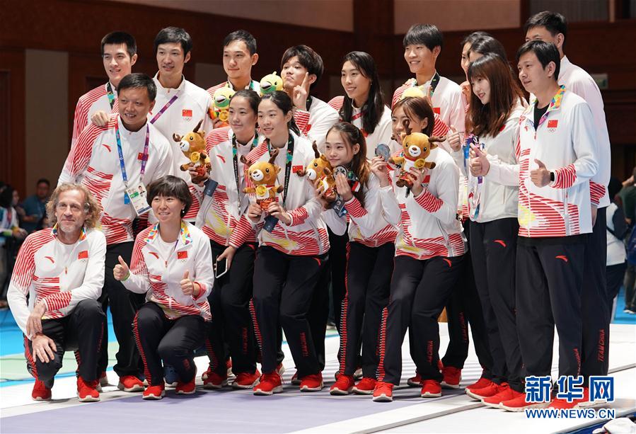 8月23日,中国队选手在赛后与教练合影留念。 当日,在亚运会女子花剑团体决赛中,中国队以34比35不敌日本队,获得亚军 新华社记者王毓国摄