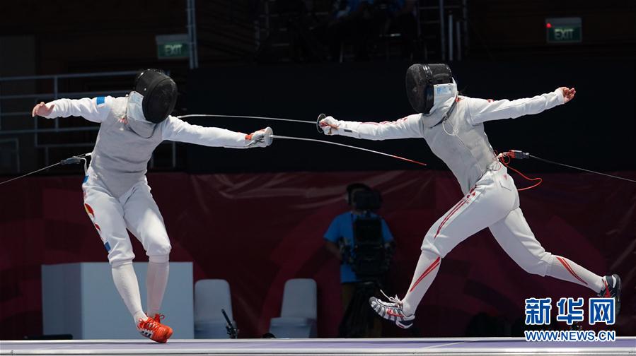 8月23日,中国队选手霍兴欣(左)在比赛中。 当日,在亚运会女子花剑团体决赛中,中国队以34比35不敌日本队,获得亚军 新华社记者王毓国摄