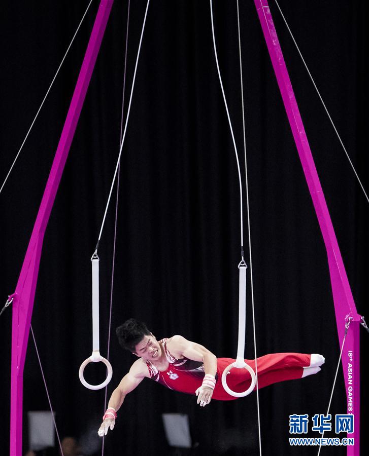 8月23日,中国台北选手陈智郁在男子吊环决赛中。 当日,在印度尼西亚雅加达举行的第18届亚运会体操男子吊环决赛中,中国选手邓书弟获得金牌,日本选手野野村笙吾获得银牌,中国台北选手陈智郁获得铜牌。 新华社记者朱炜摄