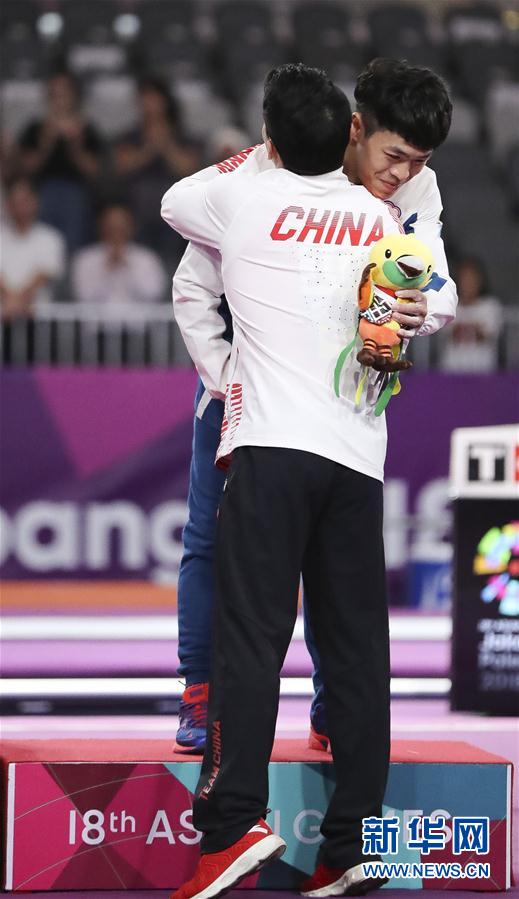 8月23日,中国选手邓书弟在男子吊环颁奖仪式上与中国台北选手陈智郁拥抱。 当日,在印度尼西亚雅加达举行的第18届亚运会体操男子吊环决赛中,中国选手邓书弟获得金牌,日本选手野野村笙吾获得银牌,中国台北选手陈智郁获得铜牌。 新华社记者朱炜摄