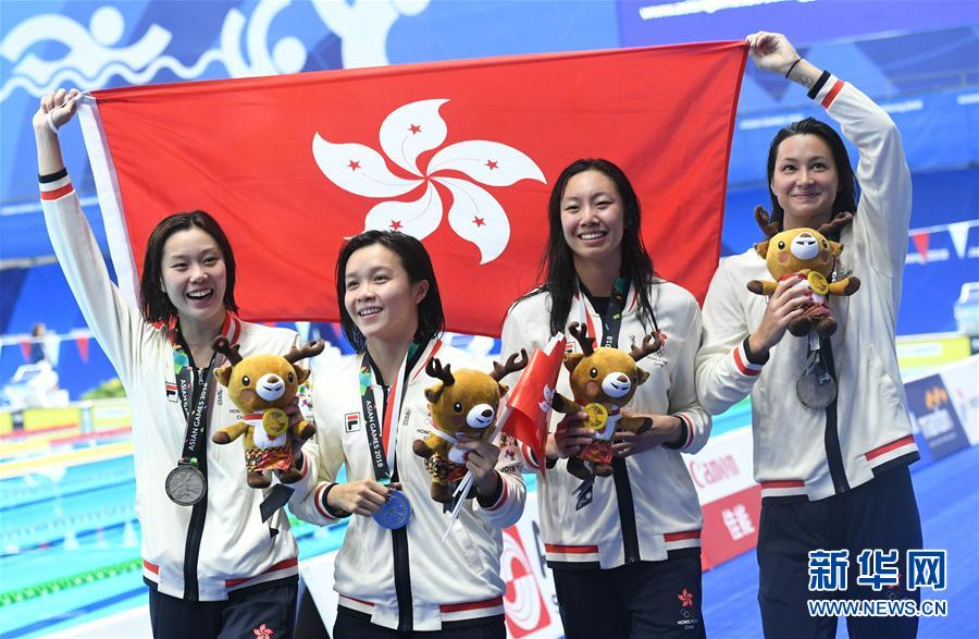 8月23日,中国香港队在颁奖仪式上。 当日,在第18届亚运会女子4X100米混合泳接力决赛中,日本队获得冠军。中国队和韩国队由于犯规被取消成绩,中国香港队获得亚军,新加坡队获得季军。 新华社记者岳月伟摄