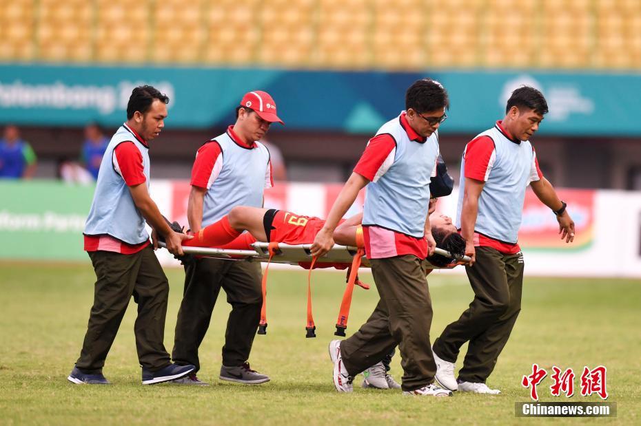 张玉宁受伤,被担架抬下场。中新社记者 杨华峰 摄