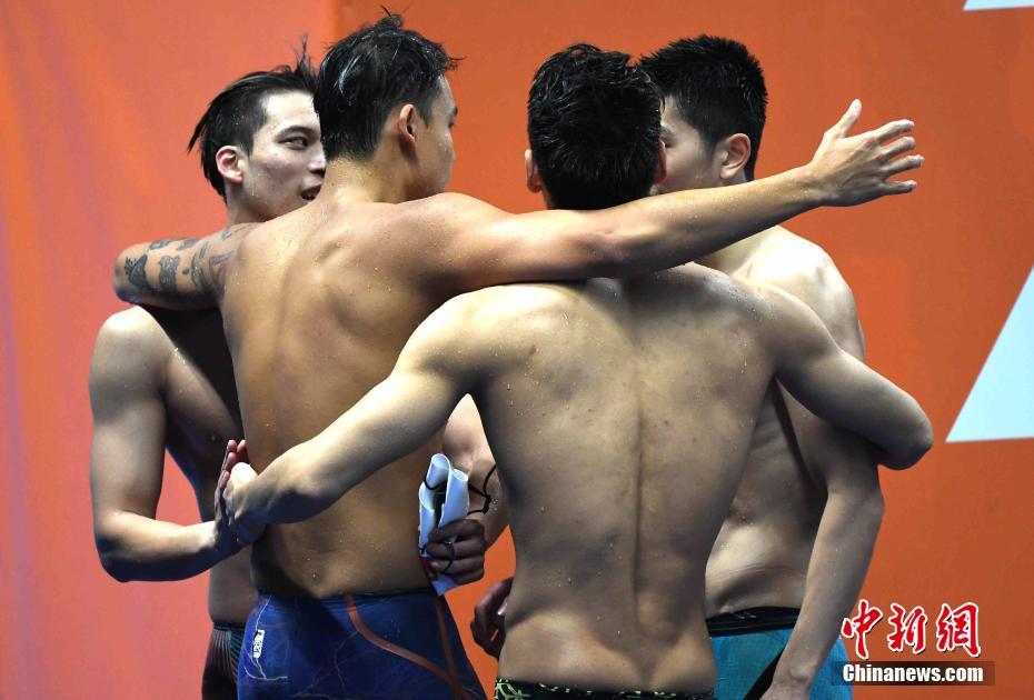 8月24日晚,亚运会游泳男子4乘100米混合泳接力决赛,中国队夺冠。中新社记者 王东明 摄