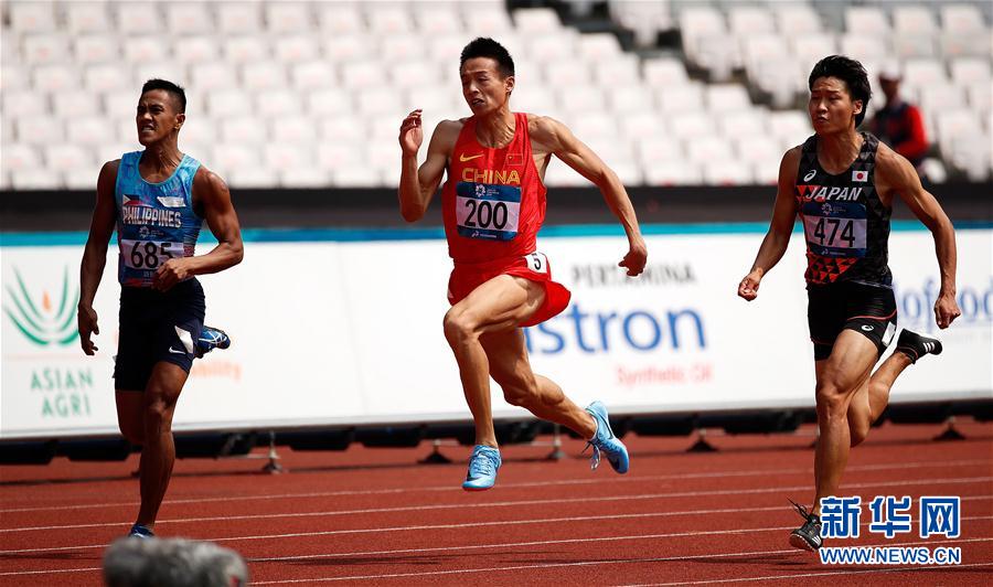 ↑8月25日,中国选手宫克威在男子十项全能100米比赛中。 当日,第18届亚运会田径男子十项全能比赛在雅加达开赛。 新华社记者王丽莉摄