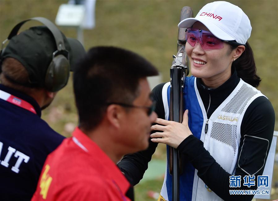 8月26日,中国选手魏萌(右一)在比赛后接受祝贺。 当日,在第18届亚运会女子飞碟双向决赛中,中国选手魏萌以54中的成绩摘得银牌。 新华社发(王申摄)