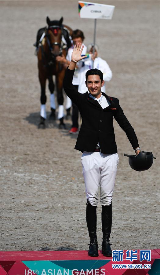 8月26日,中国选手华天在颁奖仪式上向观众挥手致意。 当日,在印度尼西亚雅加达举行的第18届亚运会马术个人三项赛中,中国选手华天获得铜牌。 新华社记者黄宗治摄