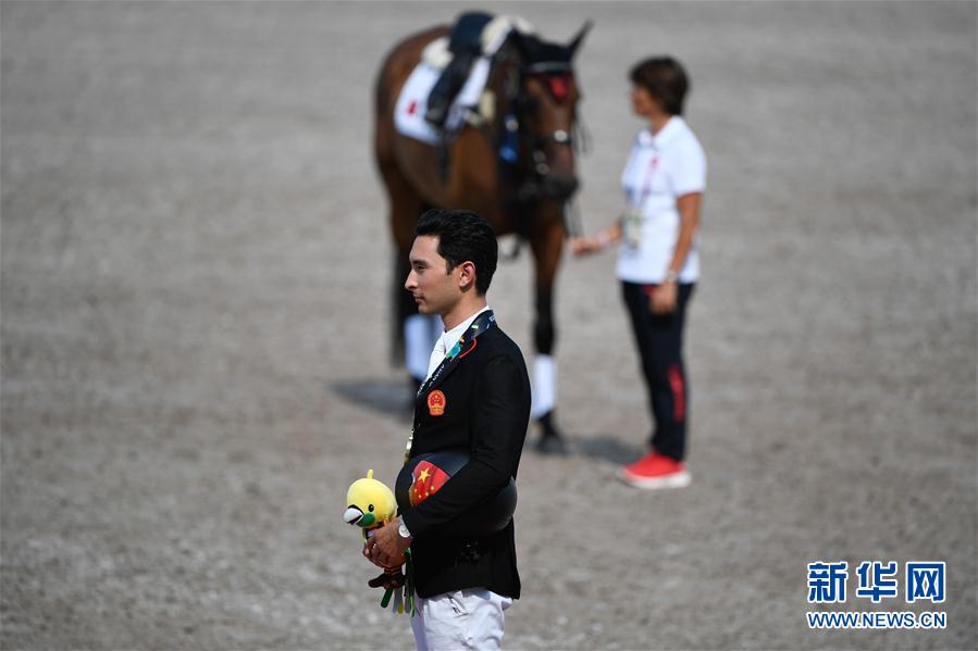 8月26日,中国选手华天在颁奖仪式上。 当日,在印度尼西亚雅加达举行的第18届亚运会马术个人三项赛中,中国选手华天获得铜牌。 新华社记者黄宗治摄