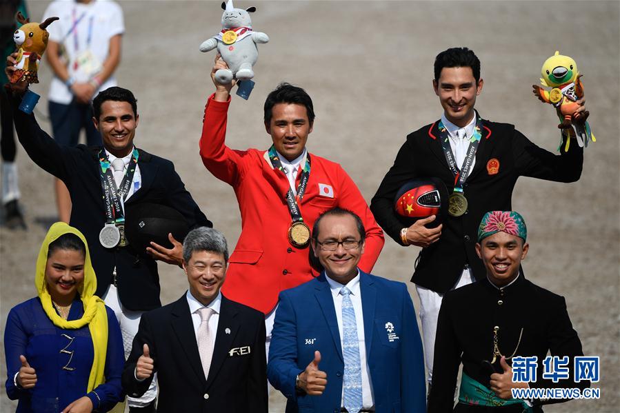 8月26日,日本选手大岩义明(后排中)、印度选手米尔扎(后排左)、中国选手华天(后排右)在颁奖仪式上。 当日,在印度尼西亚雅加达举行的第18届亚运会马术个人三项赛中,中国选手华天获得铜牌。 新华社记者黄宗治摄
