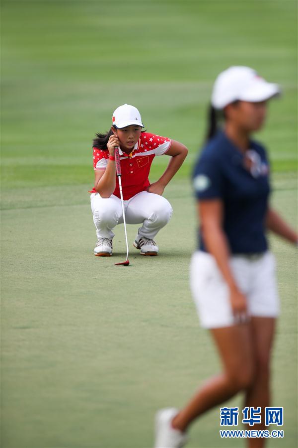 8月26日,中国队选手殷若宁(左)在比赛中。 当日,在第18届亚运会高尔夫女子团体赛中,中国队以四轮总杆数558杆的成绩获得季军。 新华社记者丁汀摄