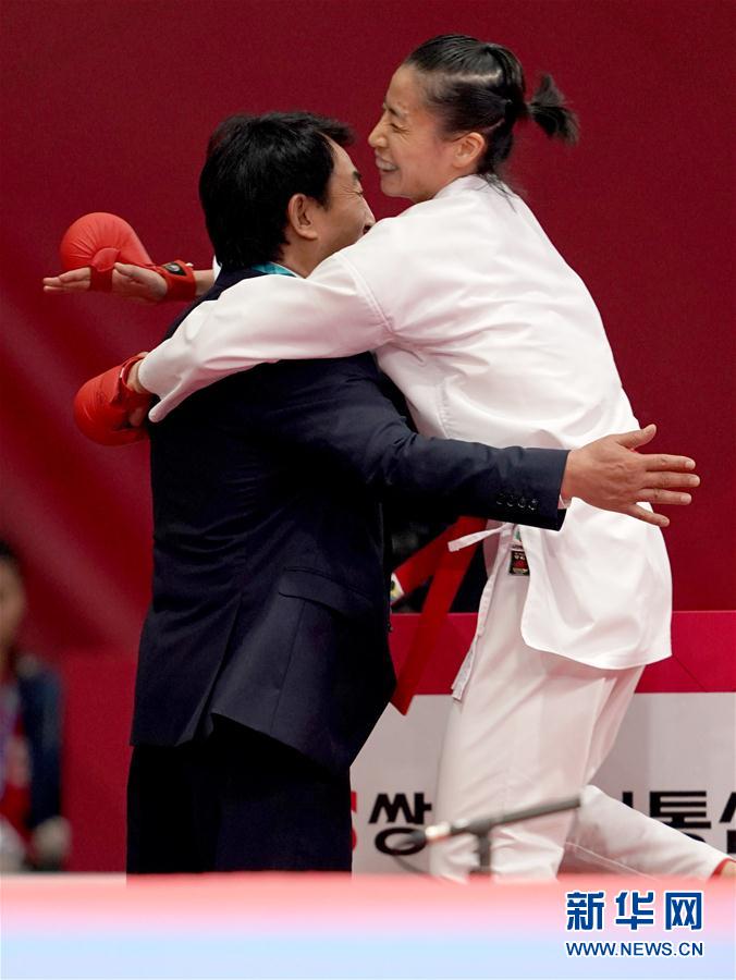 8月26日,中国选手尹笑言在获胜后与教练拥抱。 当日,在第18届亚运会空手道女子61公斤级决赛中,中国选手尹笑言战胜伊朗选手,获得冠军。 新华社记者王毓国摄