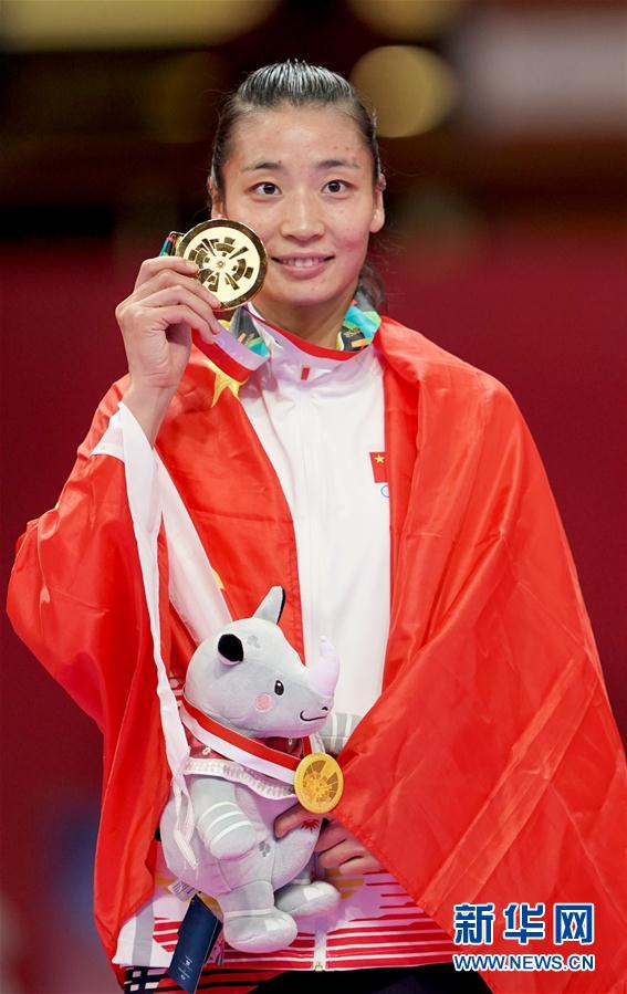 8月26日,中国选手尹笑言在颁奖仪式上。 当日,在第18届亚运会空手道女子61公斤级决赛中,中国选手尹笑言战胜伊朗选手,获得冠军。 新华社记者王毓国摄