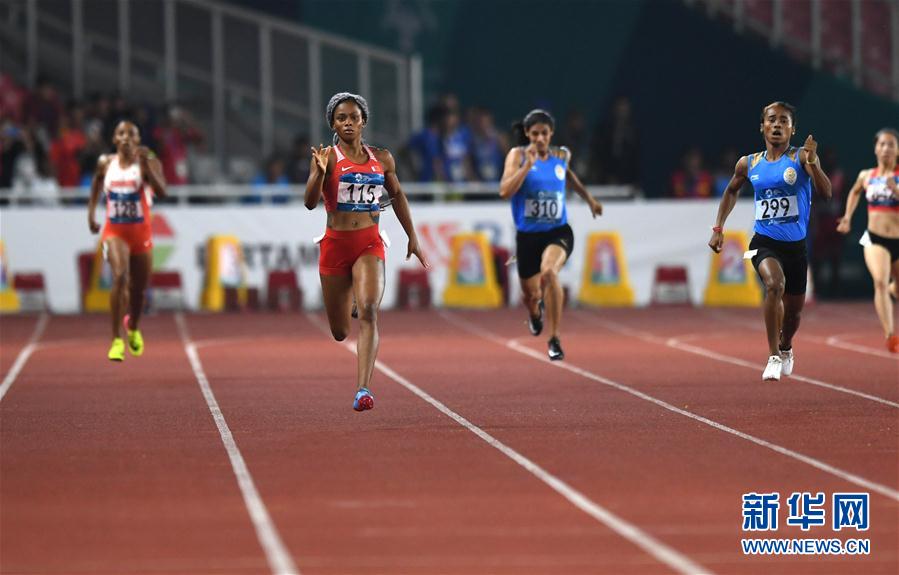 8月26日,巴林选手纳赛尔(前)在比赛中。 当日,在第18届亚运会田径女子400米决赛中,巴林选手纳赛尔以50秒09的成绩夺冠,中国选手黄瑰芬和童曾欢分获五、六名。 新华社记者岳月伟摄