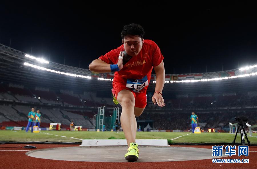8月26日,中国选手高阳在比赛中。 当日,在印度尼西亚雅加达举行的第18届亚运会田径女子铅球决赛中,中国选手巩立姣以19米66的成绩夺冠,高阳以17米64的成绩获得银牌。 新华社记者王丽莉摄