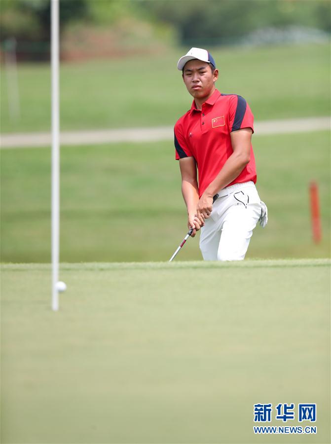 8月26日,中国队选手金诚在比赛中。 当日,在第18届亚运会高尔夫男子团体赛中,中国队以四轮总杆数843杆的成绩获得亚军。 新华社记者丁汀摄