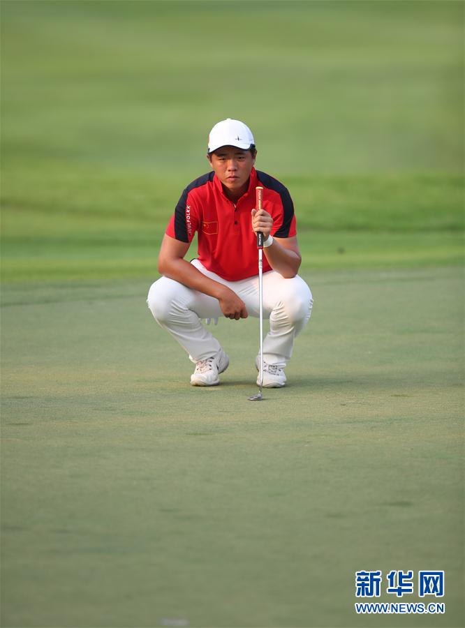8月26日,中国队选手张华创在比赛中。 当日,在第18届亚运会高尔夫男子团体赛中,中国队以四轮总杆数843杆的成绩获得亚军。 新华社记者丁汀摄