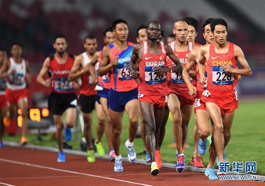 8月26日,中国选手朱仁学(右一)在比赛中。 当日,第18届亚运会田径男子10000米决赛在雅加达举行。 新华社记者岳月伟摄