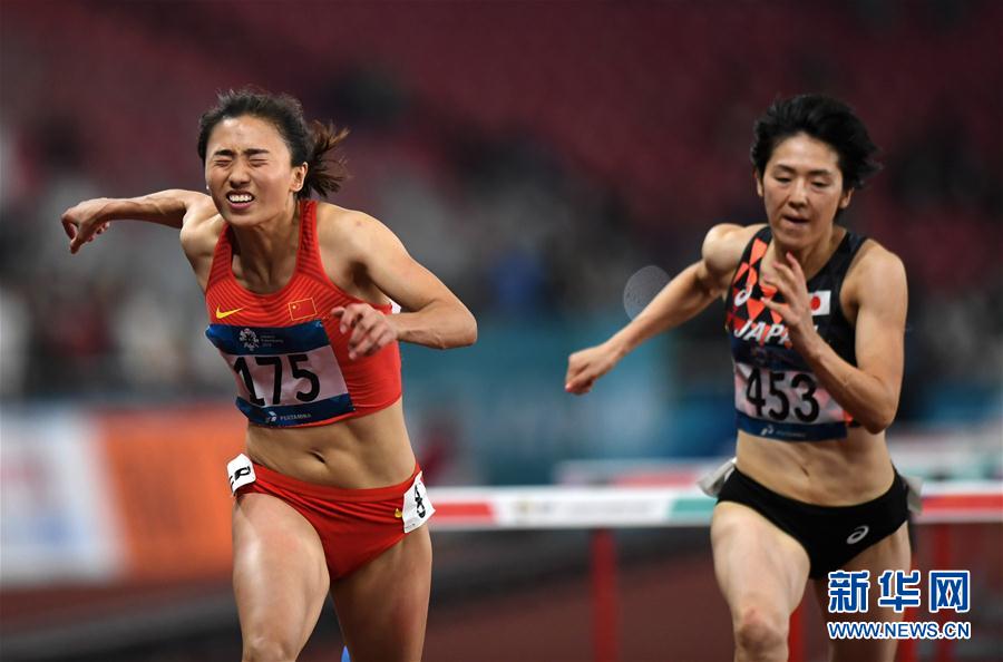 8月26日,中国选手王逗(左)在比赛中。 当日,在第18届亚运会田径女子100米栏决赛中,中国选手王逗以13秒50的成绩获得第四名。 新华社记者岳月伟摄
